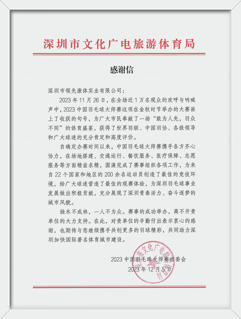2023中国羽毛球大师赛组委会感谢信
